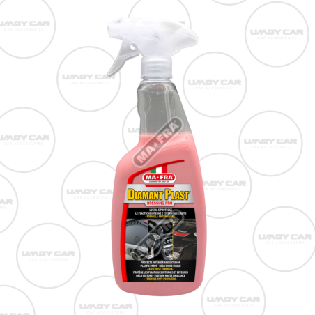 DIAMANT PLAST DRESSING PRO è il prodotto rinnovante, lucidante e protettivo per plastiche auto formulato con un mix di cera a base di Carnauba e polimeri idrofobici. La cera di carnauba è conosciuta per la sua resistenza alle intemperie e all'abrasione, aiutando a proteggere le plastiche della tua auto da danni causati dalle condizioni atmosferiche e dall'usura quotidiana. Grazie a questa innovativa formulazione lascia sulle superfici una lucentezza superiore e crea un’efficace barriera protettiva anti-UV trasparente che evita il depositarsi di sporco e polvere e previene l’invecchiamento precoce delle plastiche. DIAMANT PLAST DRESSING PRO è ideale per superfici interne ed esterne in plastica, gomma e vinile, come cruscotti, pannelli delle portiere, finiture esterne, modanature, pneumatici passaruota, plastiche del vano motore e altro e altro ancora. Inoltre, è facile da usare, basta applicare una piccola quantità su un panno pulito e strofinare delicatamente sulla superficie da trattare. La cera di carnauba lascia una finitura lucida e protettiva che dura a lungo. DIAMANT PLAST DRESSING PRO è facile e veloce da usare, la sua formula a base di polimeri sintetici con funzione di auto-livellamento dona alle superfici trattate un aspetto lucido e uniforme che dura settimane. Il prodotto si asciuga velocemente sulla superficie trattata lasciando un gradevole profumo e non sbianca le parti in plastica. 750 ML