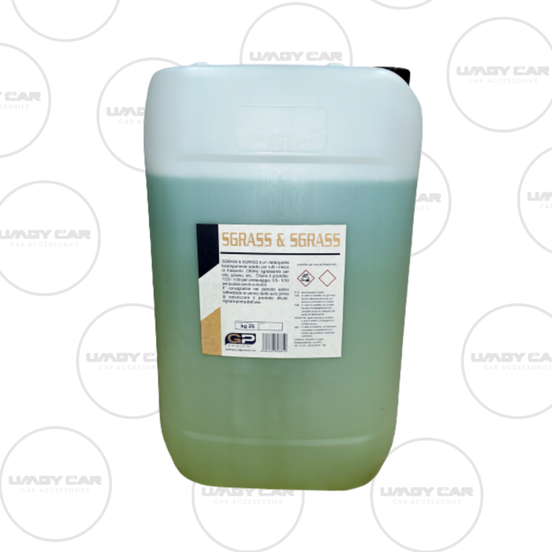 Sgrass e Sgrass è un sgrassante bicomponente adatto per tutti i mezzi di trasporto. Ottimo sgrassante per autolavaggio, officina, olio, grasso, cerchi, pavimenti, nautica, carrozzeria, tendaggio, cucina, abbigliamento da lavoro, motori etc.. Diluire il prodotto: 1/5 - 1/10 - 1/20 1-30. Agitare prima dell'uso.